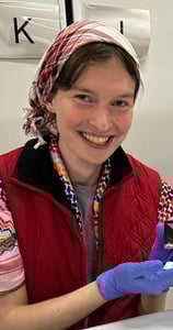Gabannette holds an artefact that she is cataloguing.
