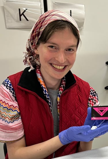 Gabannette holds a belonging that she is cataloguing.